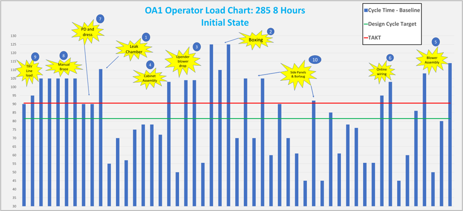 A core tool they utilized was the Yamazumi chart, which is essentially an operator load chart. This identified several workstations that were exceeding takt time, resulting in output loss. Twelve kaizen events were conducted to reduce cycle time and create flow. Marlon stated that a lot of teamwork went into this, involving several folks from the production team. Through the kaizen events, the team was able to improve line efficiency by 56% in a six-month period. The Yamazumi chart below shows the initial state and areas targeted for kaizen. Marlon summarized that they are just getting started. The beauty and excitement of the PDCA process is that there is always opportunity for improvement.