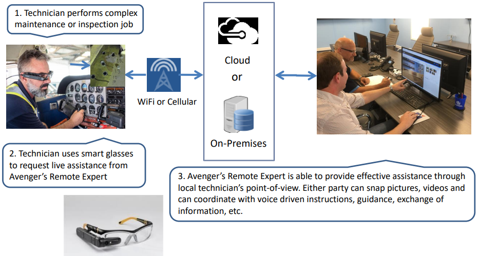 Using the Remote eye® technical assistance solution and Vuzix M300XL smart glasses provided by Gemba Systems Inc., communication, coordination, and collaboration while executing repairs, inspections or modifications are more efficient and lead to improved quality at lower overall cost. Data, such as live video, audio, pictures and other content to support repairs, inspections, testing, customer support, etc… can be shared between the local technician using smart glasses and Avenger’s remote experts, in both directions, allowing both parties to have access to the same information simultaneously.