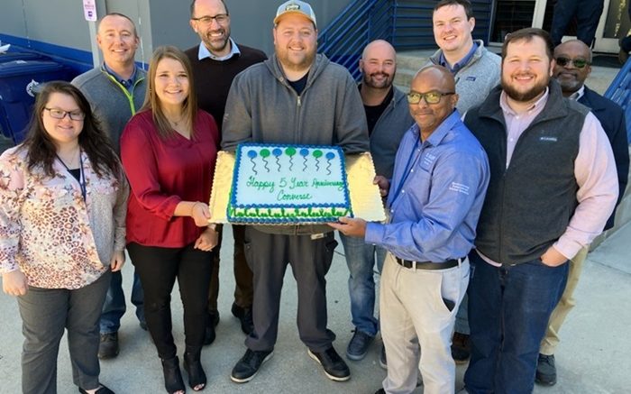 During a cake-cutting ceremony, Mark Wright, Vice President of Precious Metal Refining & Chemicals with BASF ECMS, congratulated the Converse site team on its accomplishments – not just as a vital part of the company’s catalysts and precious metals work, but as community stewards. The Converse site supports numerous local charities and volunteers actively in the Spartanburg community, most recently contributing $2,000 to United Way of the Piedmont in response to Hurricane Helene.