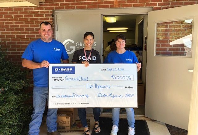 SENECA, SC, October 6, 2021 – BASF’s site in Seneca, South Carolina recently donated $5,000 to Grace’s Closet, along with personal hygiene items such as soap, toothpaste, shampoo and more. The donation will provide students in the area with access to essential personal care items through the Grace’s Closet stores located within area schools. Grace’s Closet helps students build self-confidence and success by furnishing basic resources like food, clothing, school supplies and hygiene items without the stress of economic hardship.