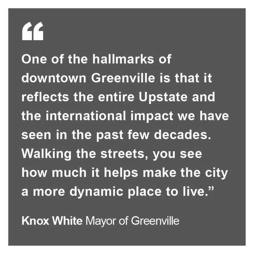 Walking under the trees along Main Street in Greenville and into the sun again down near the Poinsett Hotel and City Hall, one could close their eyes and transport themselves to stations around the world.