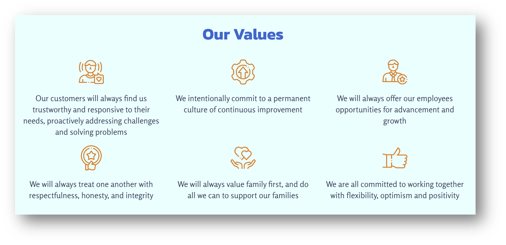 Juan proudly stated that keeping the new customers is not a problem for them. In the food distribution business, there is not much that differentiates suppliers from a product perspective – these are essentially commodity items, with very little price differential. However, a key differentiator for Carolina Food Service is their exemplary customer service, as identified in their Values.