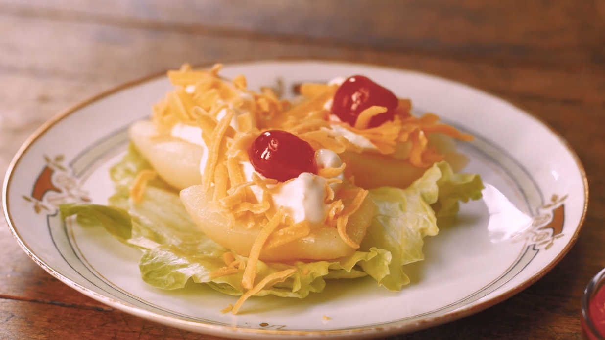 It gets worse. The mayonnaise dollop is then liberally sprinkled with…wait for it…shredded cheddar cheese. Now at this point, at best, we have an abomination created by some poor soul in the throes of a really bad moonshine hangover, but here’s the topper, literally. A maraschino cherry. Rounding out the motely assortment of ingredients, none of which have any right associating with one another, is a plump, unnaturally red cherry. The funny thing about pear salad, though, is I remember thinking it was such a glamorous dish. Which goes to show, it’s all about marketing and product placement. Mama would break out the fine china and serve this atrocity during special occasions, which, I suppose, blunted my senses to the true horror of it all.