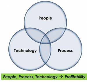 There are fundamentally three arenas that must be addressed and aligned for a successful transformation – People, Process, and Technology. The people do the work, processes organize the work to effect efficiency, and technology automates tasks, reducing cycle times and reducing waste. Managing these arenas is analogous to a three-legged stool – if one of the legs is out of sync with the other two, the stool will be off-kilter and could topple.