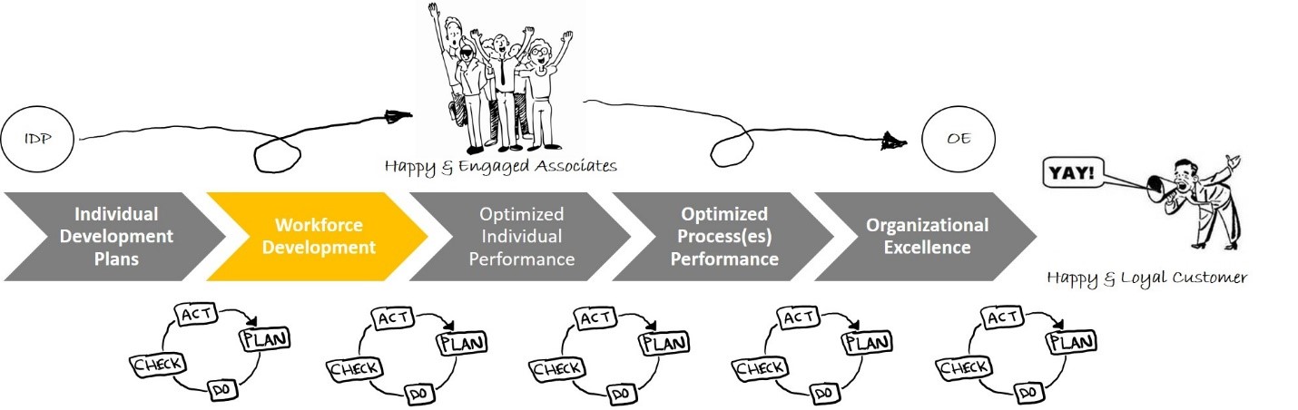 I remember as a kid reading about how a man literally ate an airplane[2]. How did he do it? One tiny bite at a time. This same concept can be applied to the sum of individual performance and its effect on overall organizational performance. The bridge that connects individual performance to optimized process performance, and on to overall organizational performance, is workforce development. Figure 1 illustrates the path from individual development plans (IDP) to organizational excellence (OE).