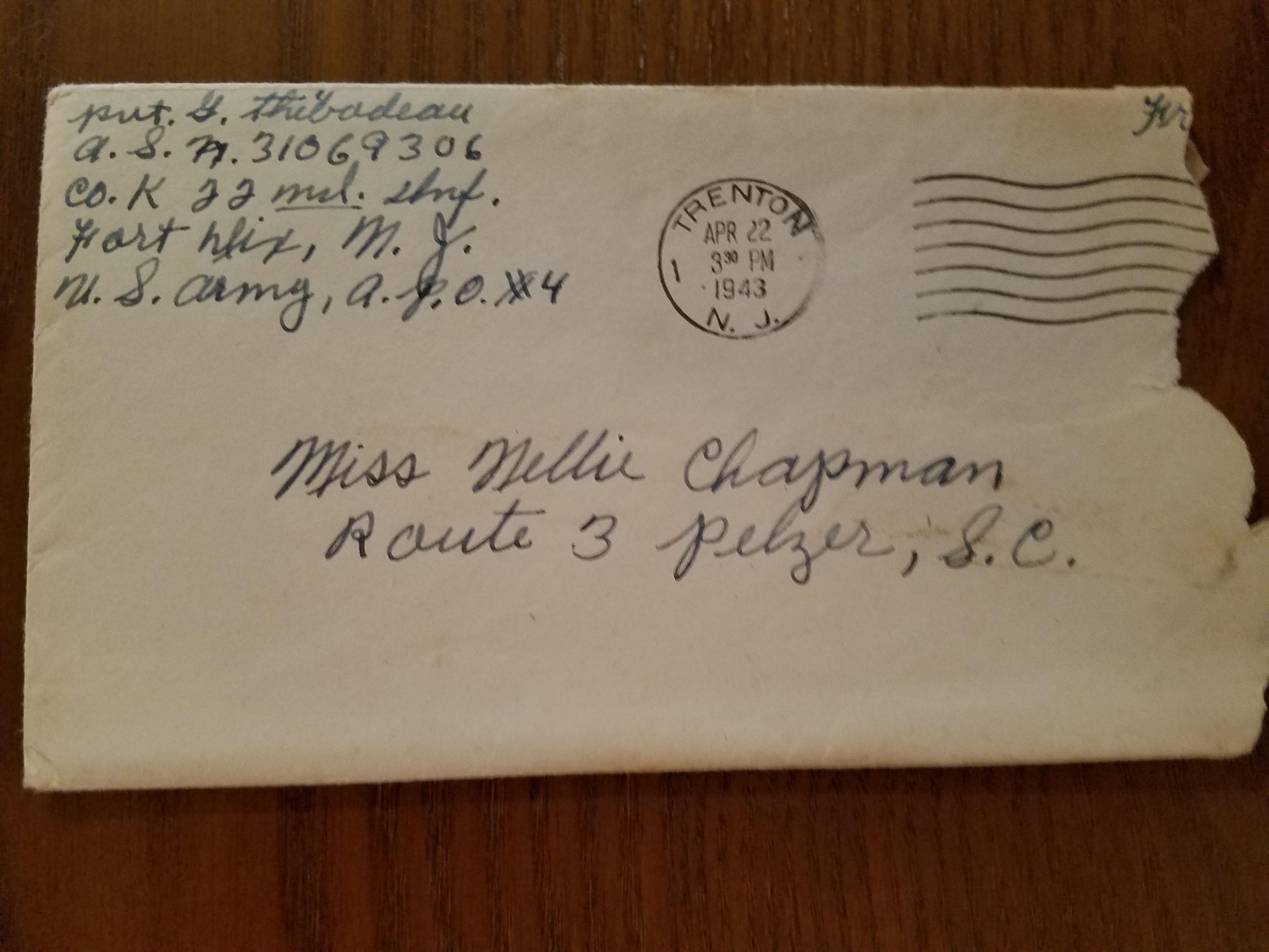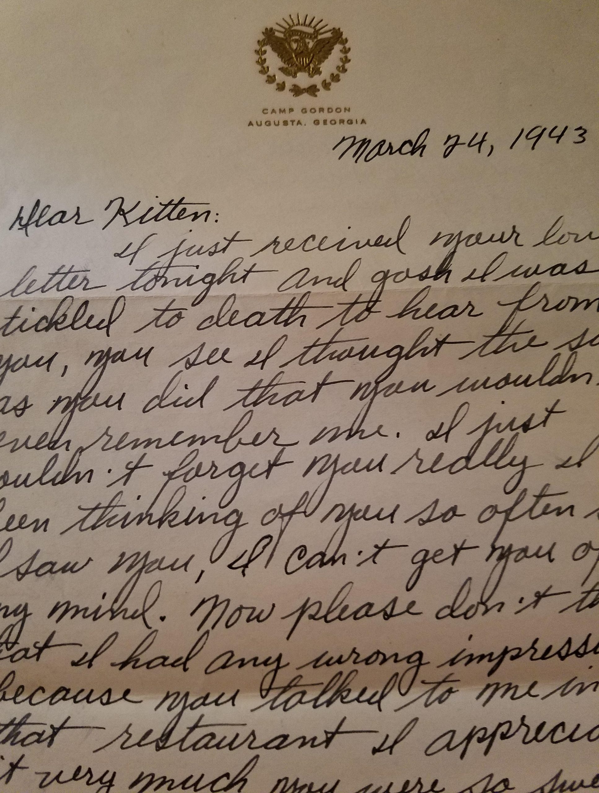 It is a distinctly uncomfortable sensation to see one’s grandmother addressed as “Kitten” by a man other than one’s grandfather. But that seems to have been the preferred pet name by which a young Private Gordon Thibodeaux addressed my grandma, Nellie.