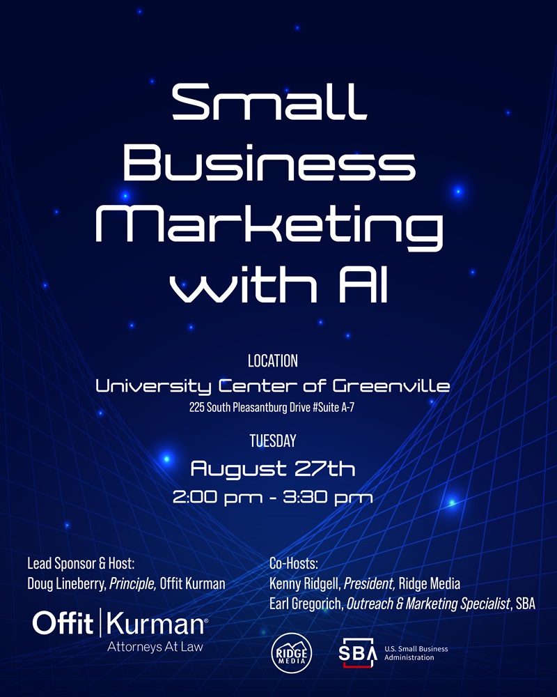 You’ve heard the buzz and seen the news—now learn how to safely use artificial intelligence to market your small business. This event will feature experts from Offit Kurman, Ridge Media, and the Small Business Administration discussing the applications, benefits, challenges, and legal considerations of implementing AI in small business marketing.