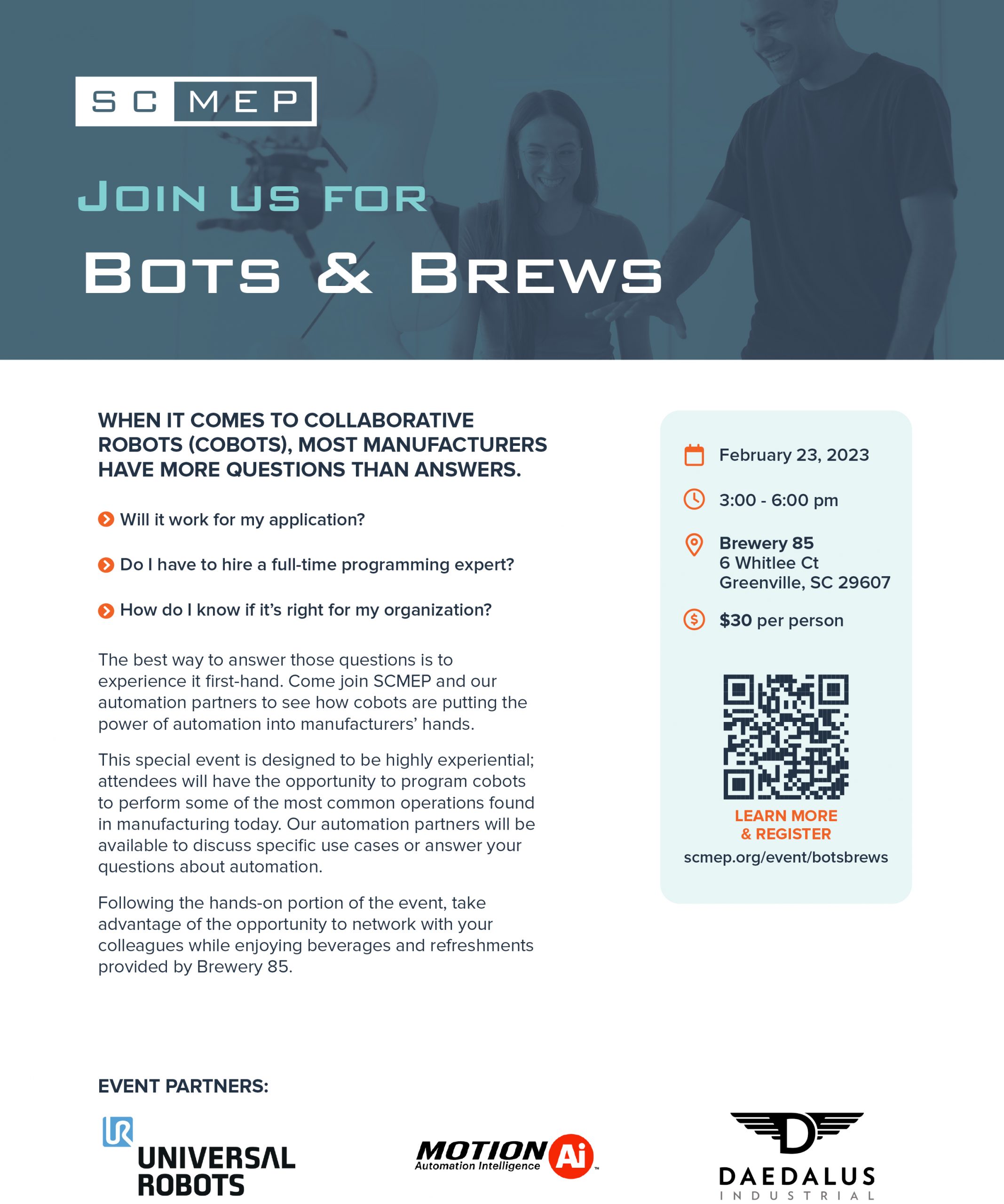 Join Us for “BOTS & BREWS” Posted By: SCMFG/Staff January 1, 2023 Register for this Event Today! Register for this Event Today!