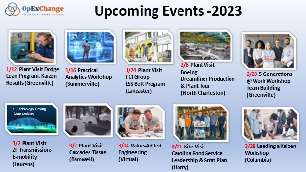 Mike was visibly excited to share the agenda for the start of 2023. Ten events are scheduled for the first quarter including six plant visits, three four-hour workshops, and a virtual session on value analysis and value engineering. The plant visits and workshops are spread throughout the state. A calendar graphic is below.