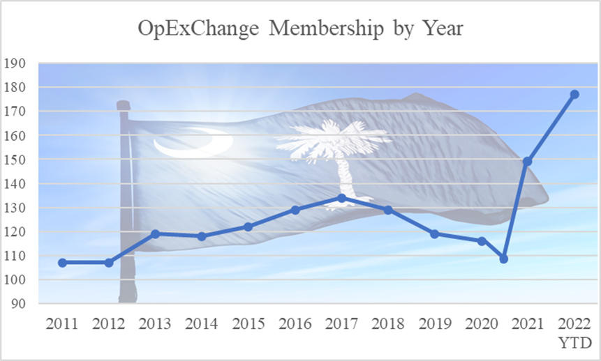 The OpExChange is growing! In the last two and a half years, there was a net growth of 65% – from 107 companies in mid-2020 to 177 companies in mid-December of 2022. What is so remarkable about this growth is that it occurred during the peak of the pandemic, when many companies were limiting plant visits. Mike commented that much like the manufacturing base in South Carolina, the OpExChange adapted and improved during this time.