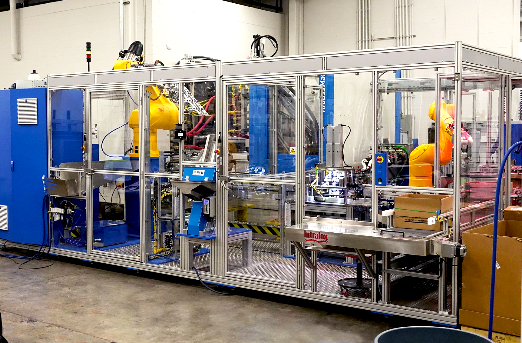 ts and loads the next set of insets into the mold. The robot places the parts on to a conveyor where they are moved to a small machine that snaps the upper and lower rollers into position. The part then moves to the end of the conveyor where a small six axis robot places the parts into a layer for loading into the box. A camera above the layer inspects the parts for correct type and assembly. Once a layer is completed the small robot changes its tooling and pick and places the layer of parts into a box. This machine produces a part every 11.25 seconds.