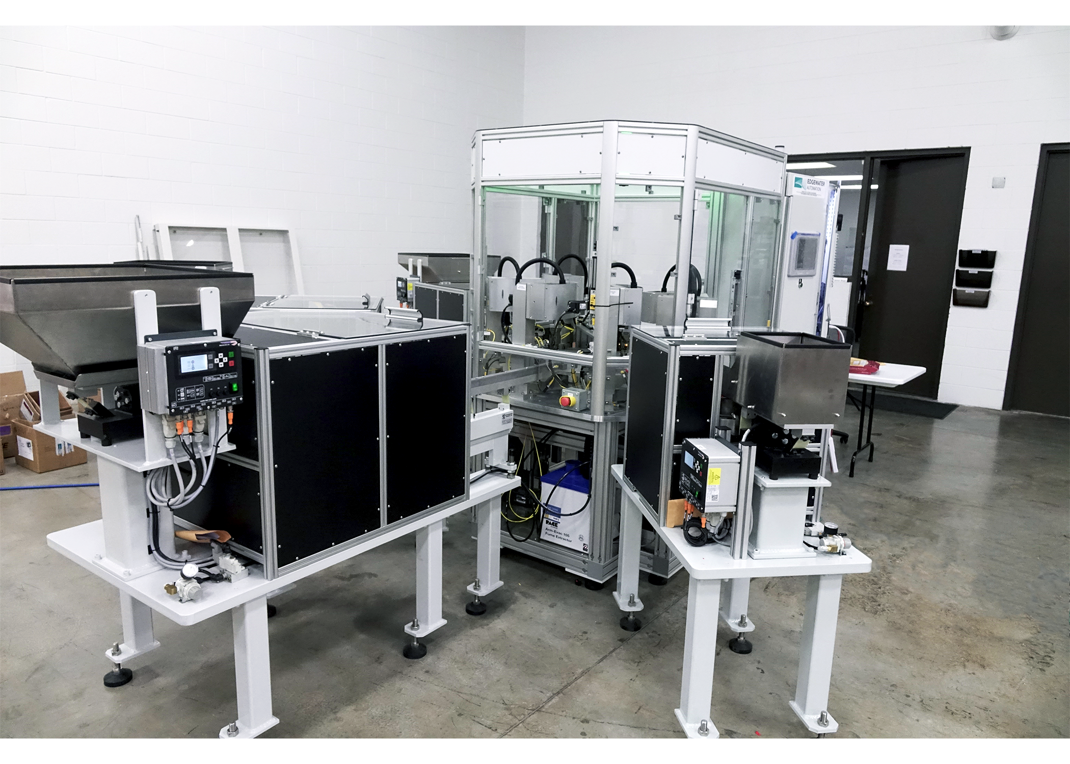 on and it sends the location of the part to the robot so that it can pick it up. The parts are progressively assembled and are verified with inspection cameras for correct part type, color and proper assembly. Once the parts are fully assembled they are loaded into a test dial. The test dial verifies that the rollers spin freely and another camera verifies that the axle pin is properly located within .007”. The completed part is then loaded to a pallet and presented to the operator for packaging. This machine produces a part every 14 seconds