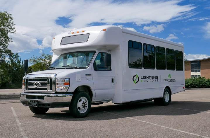 The Lightning Electric E-450 (pictured) and F-550 commercial electric vehicles are available in a shuttle bus configuration.