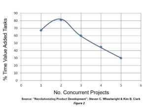 development resources work on many projects simultaneously. This is especially true where there might be a single resource with a specialized skill set who invariably ends up on the critical path of every project. Asking your key development resources to work on more than about two projects simultaneously not only reduces their effectiveness, as shown in Figure 2, but increases project dependencies.