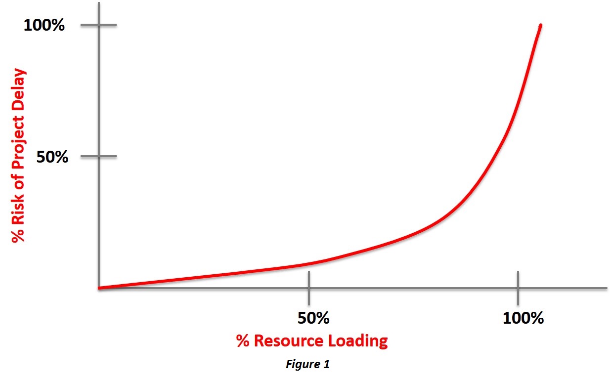 The focus in most organizations is “efficiency”. That translates to senior management insisting that development resources be utilized fully. Slack in the system is be avoided if you value your career. There is just one problem with this mentality. In most organizations, there are development resource dependencies. What happens on one project affects other projects. Figure 1 illustrates the point, though the exact shape of this curve will vary by company. The new product development process is a complex system, and as you approach 100% loading, in my experience you have a 100% chance that many or all projects will be delayed (3).