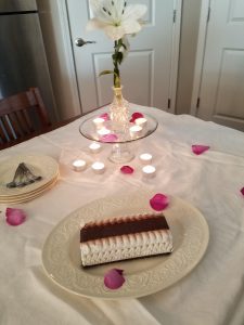 A single white lily became a centerpiece, accompanied by lovely violet rose petals. Votive candles, and a set of souvenir spoons from Norway (the closest thing I had to fancy dessert spoons,) completed the tableau. And then it was time.